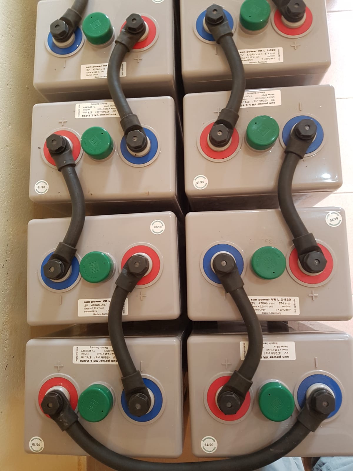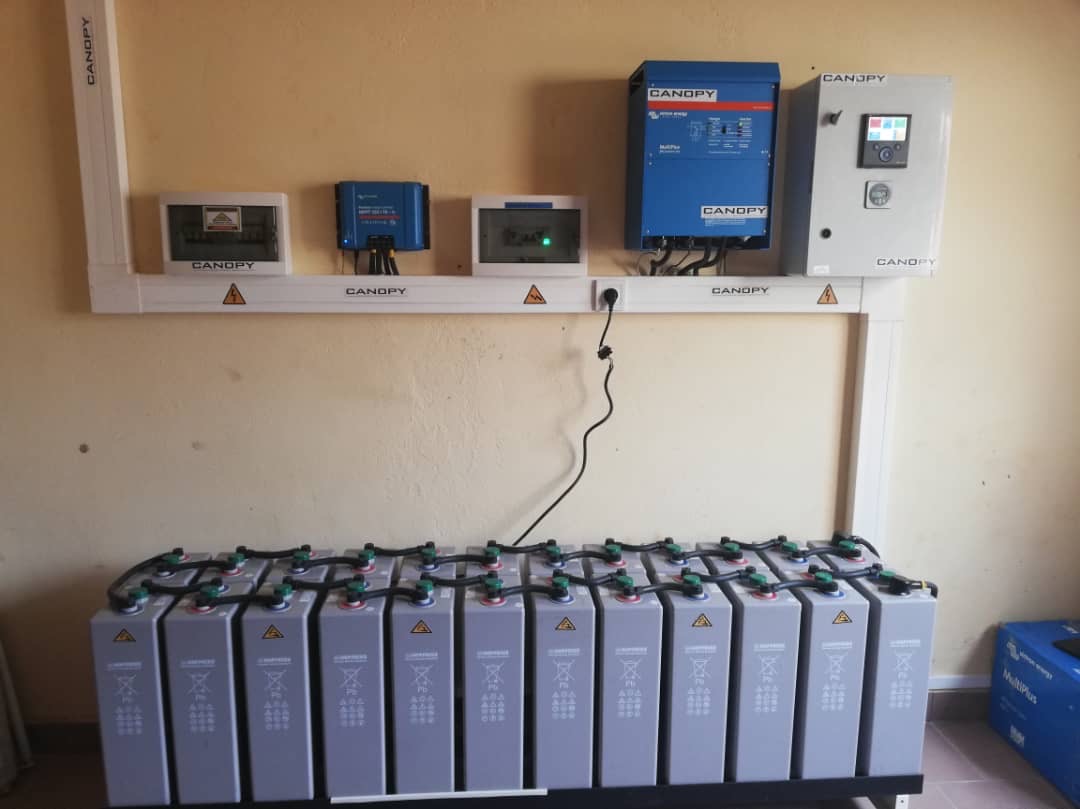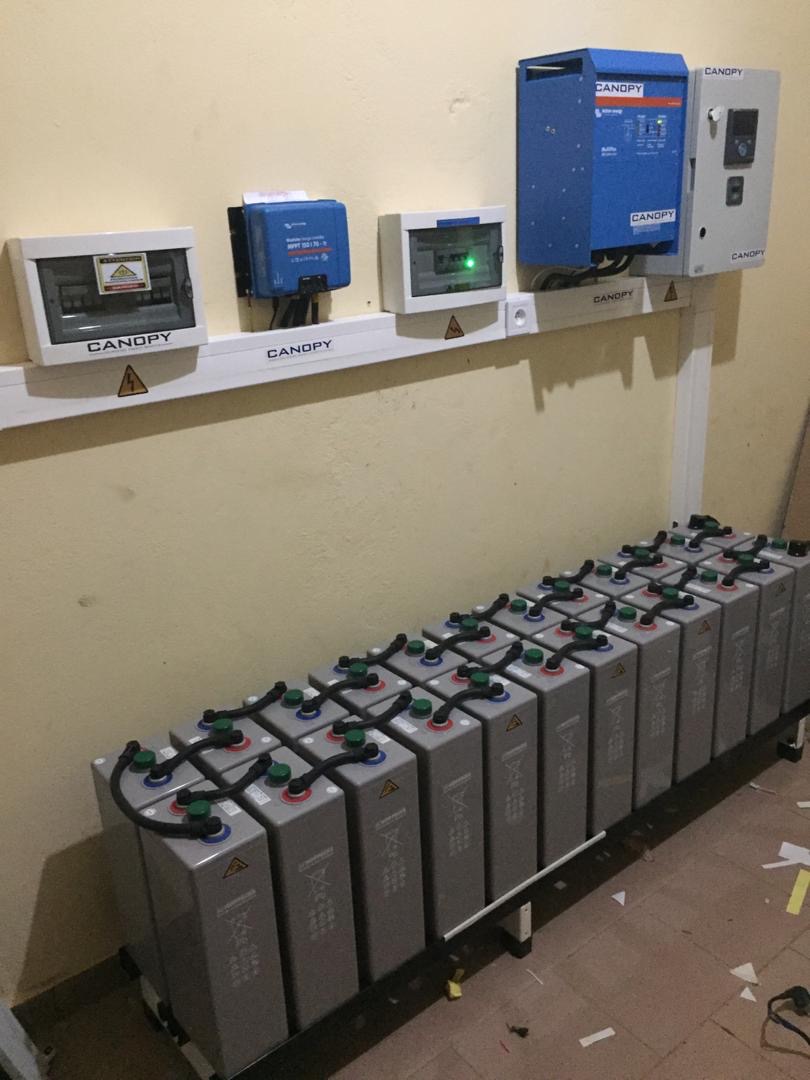 Local technique ou les 24 batteries stockent l'électricité produite par les panneaux solaires pour la distribuer dans l'installation selon les besoins.
